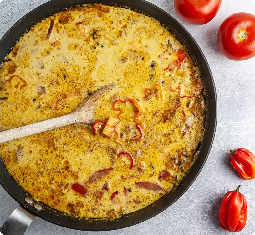 The contrasting flavours in this curry are what make it so special. Creamy coconut milk blends the sweetness of the banana with the delicate seafood flavour of prawns. Then you have the super spicy bonnet chilli that tries to win over your taste buds with fiery Jamaican flavours.